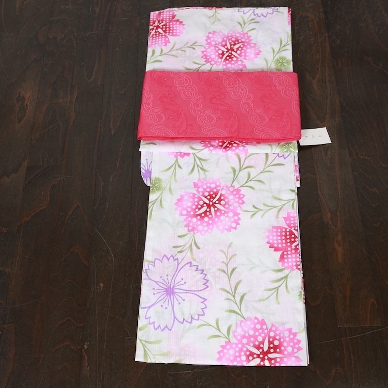 - 浴衣2点セット 新品 白 ピンク 緑 撫子 浴衣 半幅帯 / O13