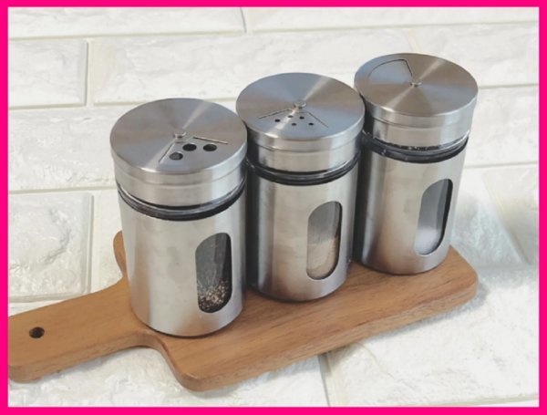 - 【3個:スタイリッシュな調味料入れ:ステンレス & ガラス:送料無料】★ペッパー/胡椒/コショウ/こしょう・塩/しお・唐辛子/七味唐辛子/七味