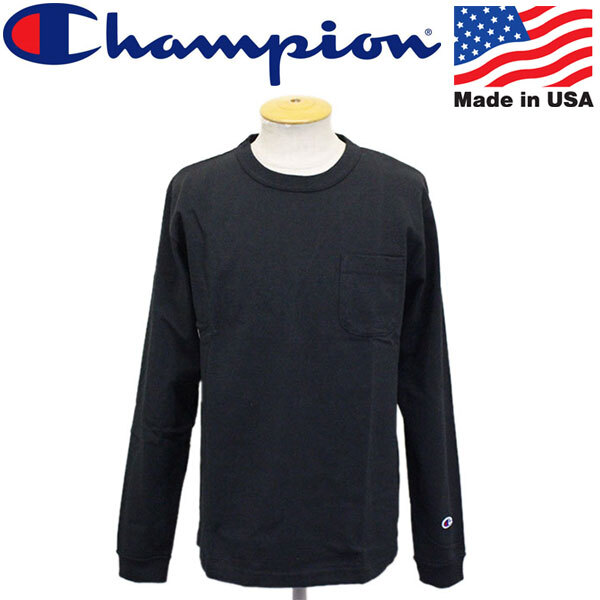 > Champion (チャンピオン) C5-P401 LONG SLEEVE T-SHIRT ポケット付き ロングスリーブTシャツ アメリカ製 CN044 090ブラック S