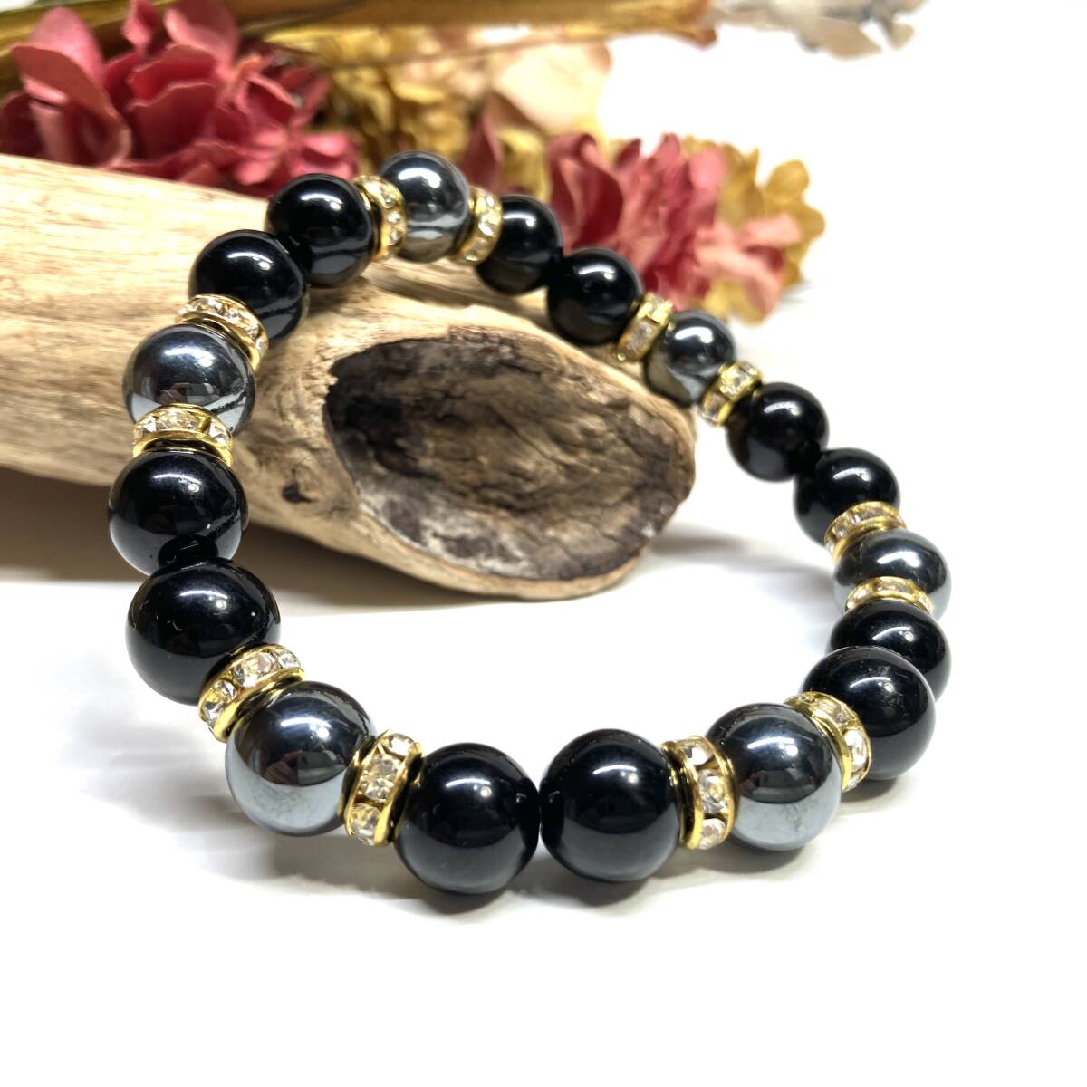 > モリオン&ヘマタイト パワーストーン ブレスレット 天然石ブレス (ゴールド) 10mm メンズ・レディース 厄除け 健康運 ☆