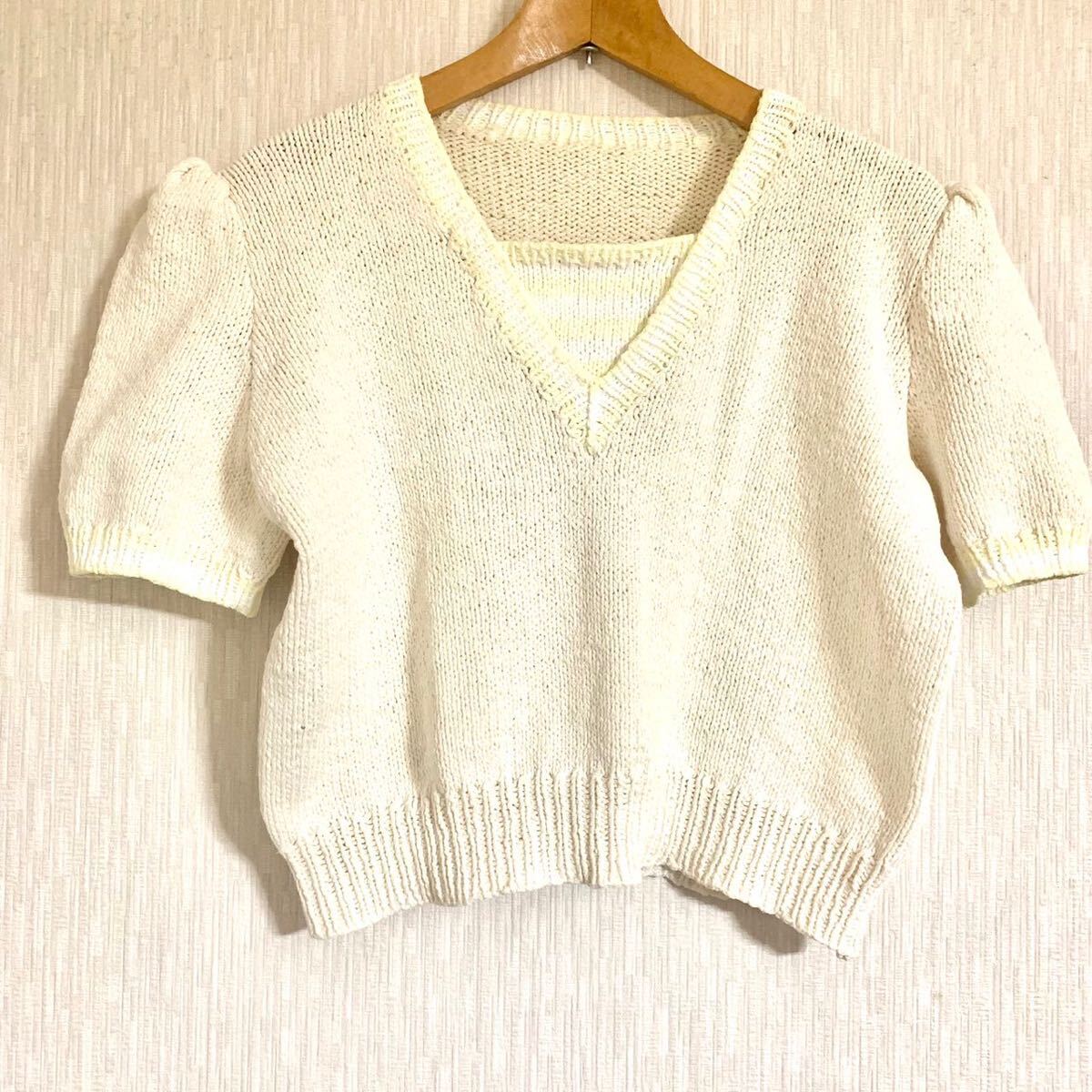 - 匿名配送 コットン半袖ニットトップス 綿サマーセーター クリーム色 黄色 レモンイエロー 半袖セーター