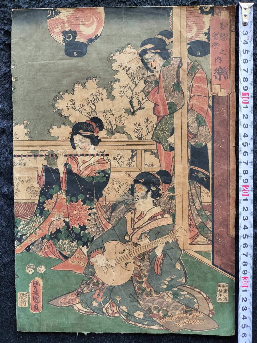 - 江戸期/真作 歌川豊国「喜怒愛樂之樂」本物浮世絵木版画 美人画 錦絵 大判 裏打ち