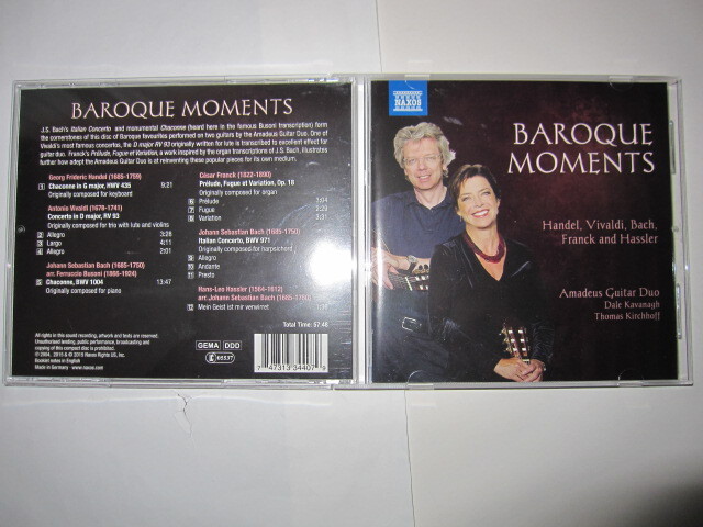 結成から25年、アマデウス・ギター・デュオは常に「ギター・デュオ」の分野で先進的な役割を果たしてきました。彼らは2台のギターでの演奏だけでなく、オーケストラと共演したり、更にギターの台数を増やしたりと、様々な試みを行い、ギター・アンサンブルの可能性を探求しているのです。このアルバムは「バロック・モーメンツ=バロックの時」と題されていて、ヘンデルやヴィヴァルディ、バッハの名曲を次々をギター2台で聴かせるというものですが、実はもう一ひねりされており、例えばバッハから派生したブゾーニの編曲や、バッハから触発されたフランクのオルガン作品をギター・デュオにアレンジするという試みにもチャレンジ。これがまた心憎いほどにはまっているのがさすがです。元々は独奏ヴァイオリンのための「シャコンヌ」が、ブゾーニによってピアノに置き換えられ、今回、250年を越えた年月を経てギター・デュオに変容している様子も何とも感動的です。