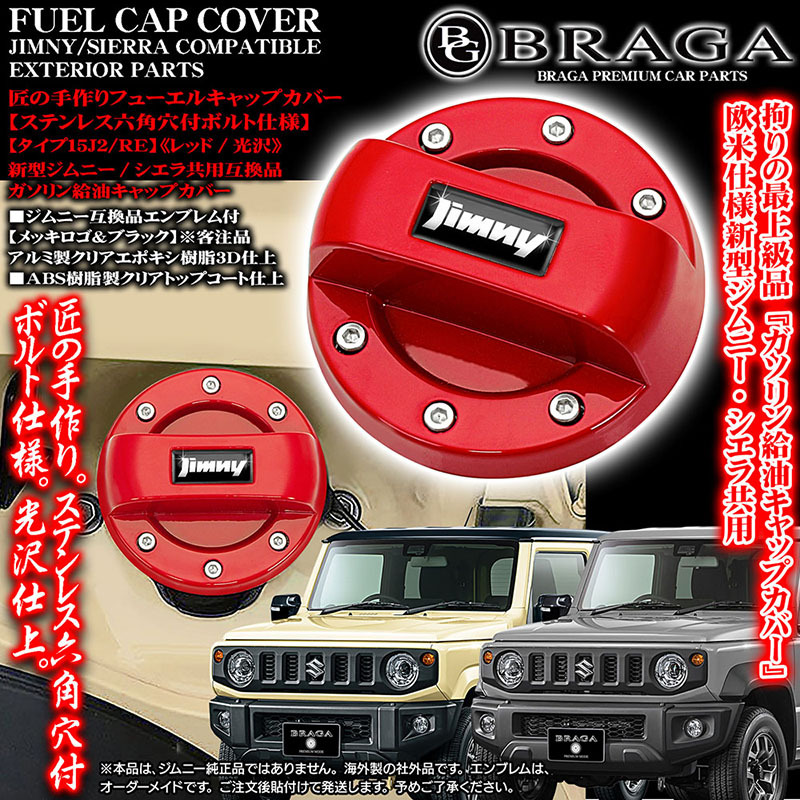 - 匠の手作り/タイプ15J2/RE/ジムニーエンブレム付シエラ共用給油フューエル キャップ カバー/レッド/光沢ABS/ステンレス六角穴ボルト/BRAGA
