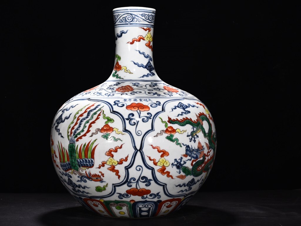 - TA227■中国古玩 唐物 明宣徳青花五彩龍鳳凰紋天球瓶 時代物 極上品■