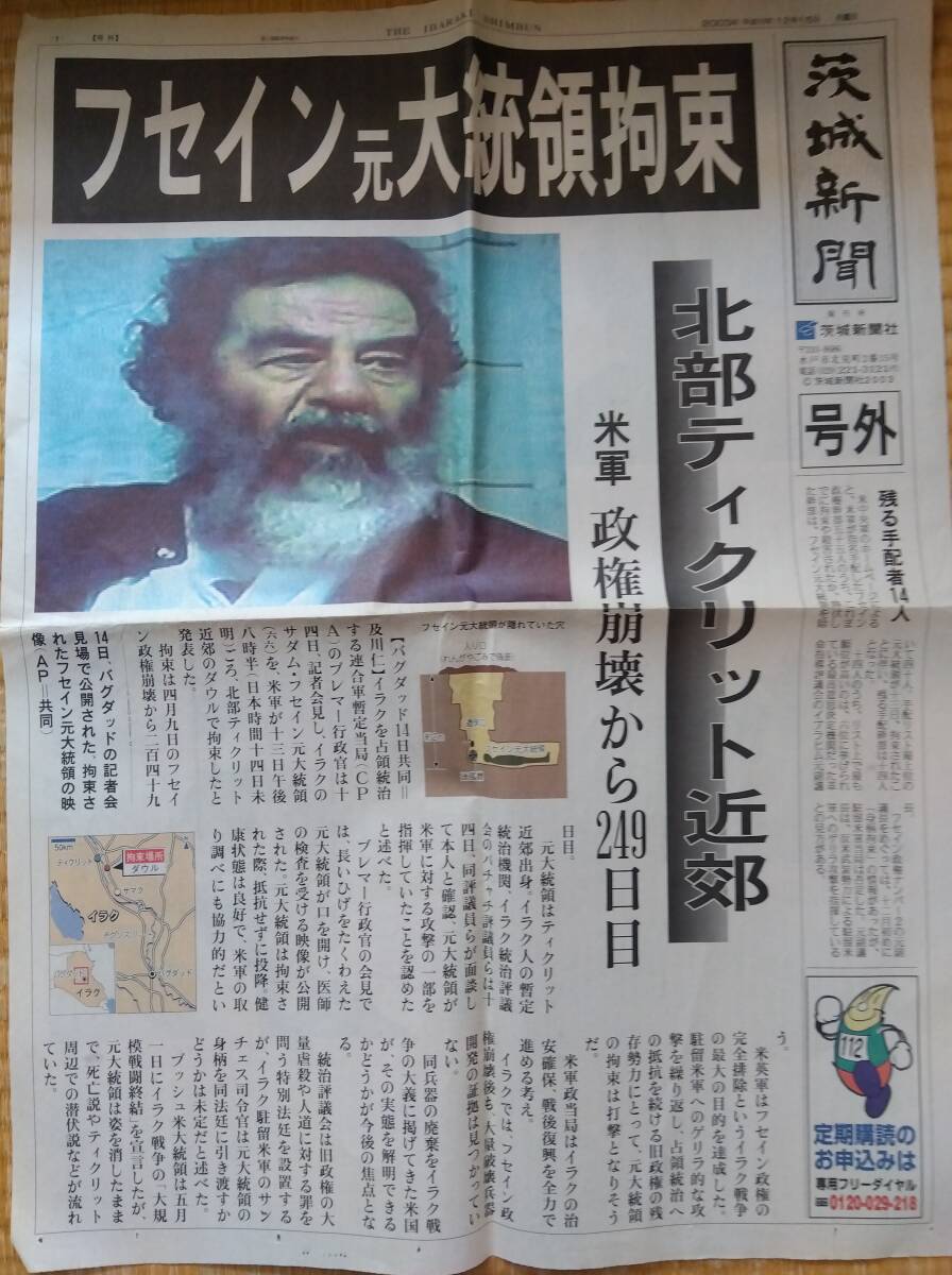 - 新聞 フセイン元大統領拘束 イラク戦争 2003.12.15 茨城新聞 号外