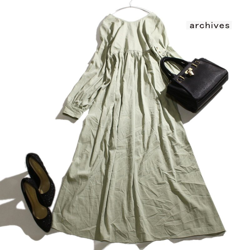 > 美品 archives アルシーヴ 春 夏 ストレッチ ゆったり レーヨン シャツ生地 マキシワンピース ロングワンピース M 淡い グリーン 緑 カーキ