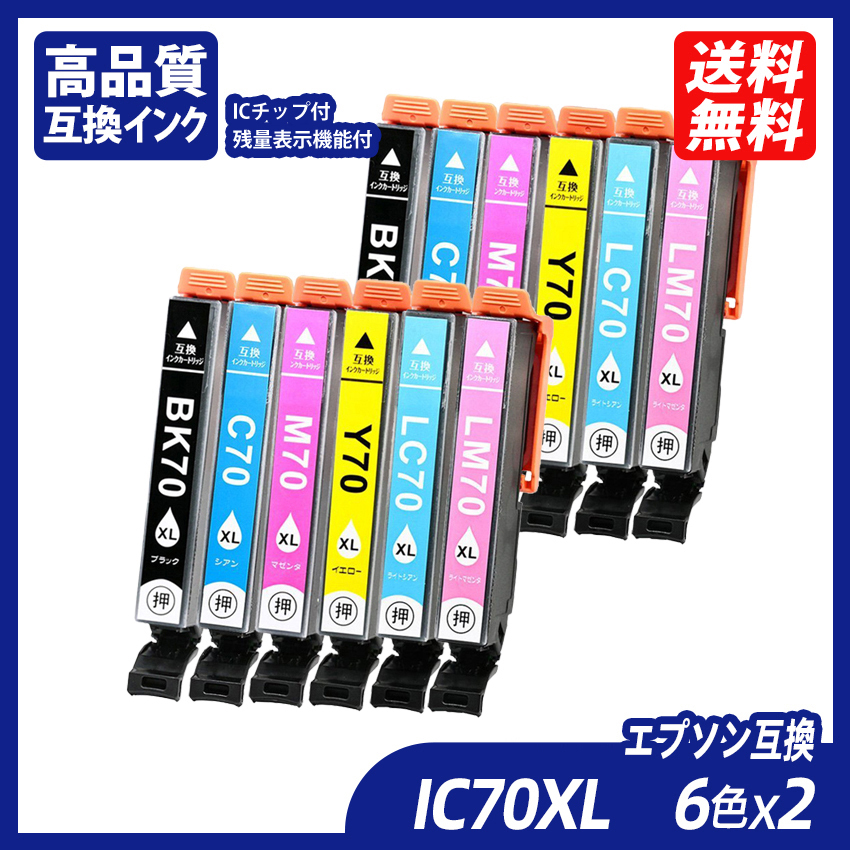 - IC6CL70L×2 6色パック×2 計12本増量タイプ EP社用互換インク ICチップ付残量表示ICBK70L ICC70L ICM70L ICY70L ICLC70L ICLM70L ;B10236;