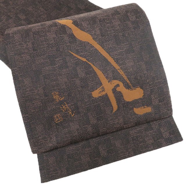- 袋帯 中古 リサイクル 正絹 カジュアル 仕立て上がり お太鼓柄 作家物 落款 文字 焦茶色 茶系色 きもの北條 A1190-15