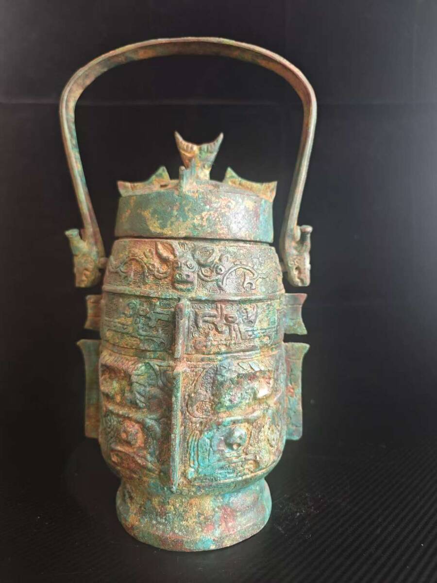 > V037 中国青銅器 獸紋提梁 酒器 時代物 持ち手付き高さ35cm/持ち手なし高さ 28cm/幅 17.5cm/重量3084g