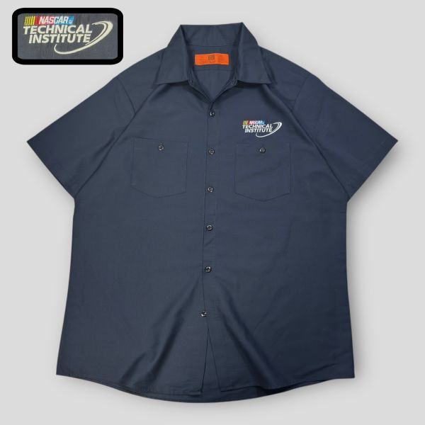 > ★NASCARロゴ刺繍★REED 半袖ワークシャツ sizeL ダークネイビー系 古着 クリーニング プレス済み ネコポス可 2152