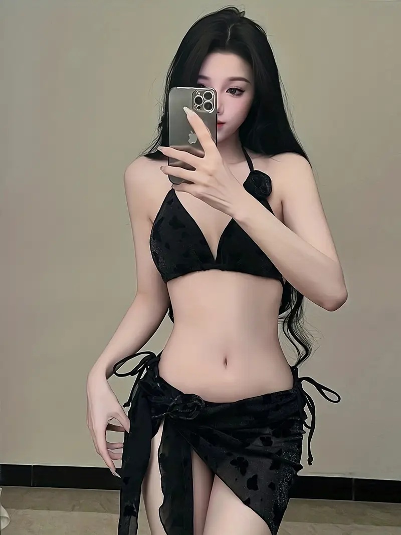 > 無難な黒セクシーであり引き締まって見えます小さな胸の方でも安心設計ホルターネックビキニ☆三点セット海に是非水着オススメスイムウェア