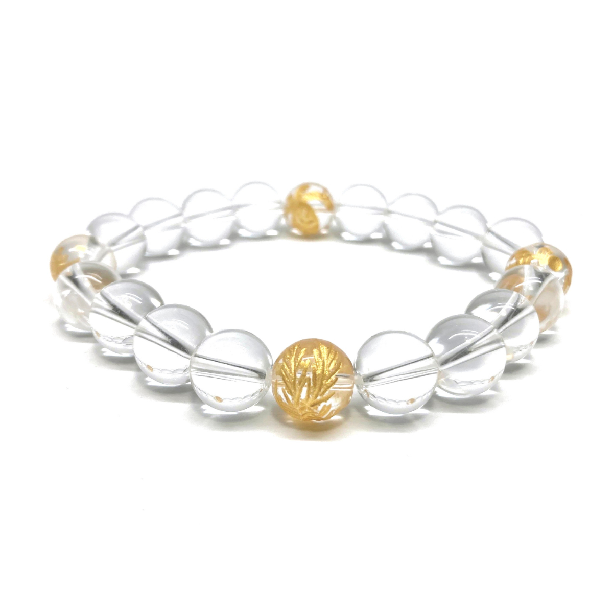 - 10mm 四神獣金彫水晶×水晶 パワーストーン ブレスレット天然石 運気上昇 開運 金運 恋愛運 青龍 白虎 玄武 朱雀 4月誕生石 ☆