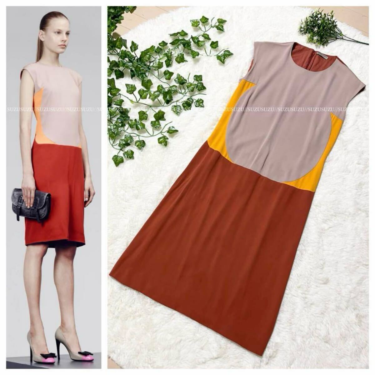 - 本物 コレクションモデル ボッテガヴェネタ シルク100% 配色切替デザイン ノースリーブ ワンピース ドレス 42 BOTTEGA VENETA