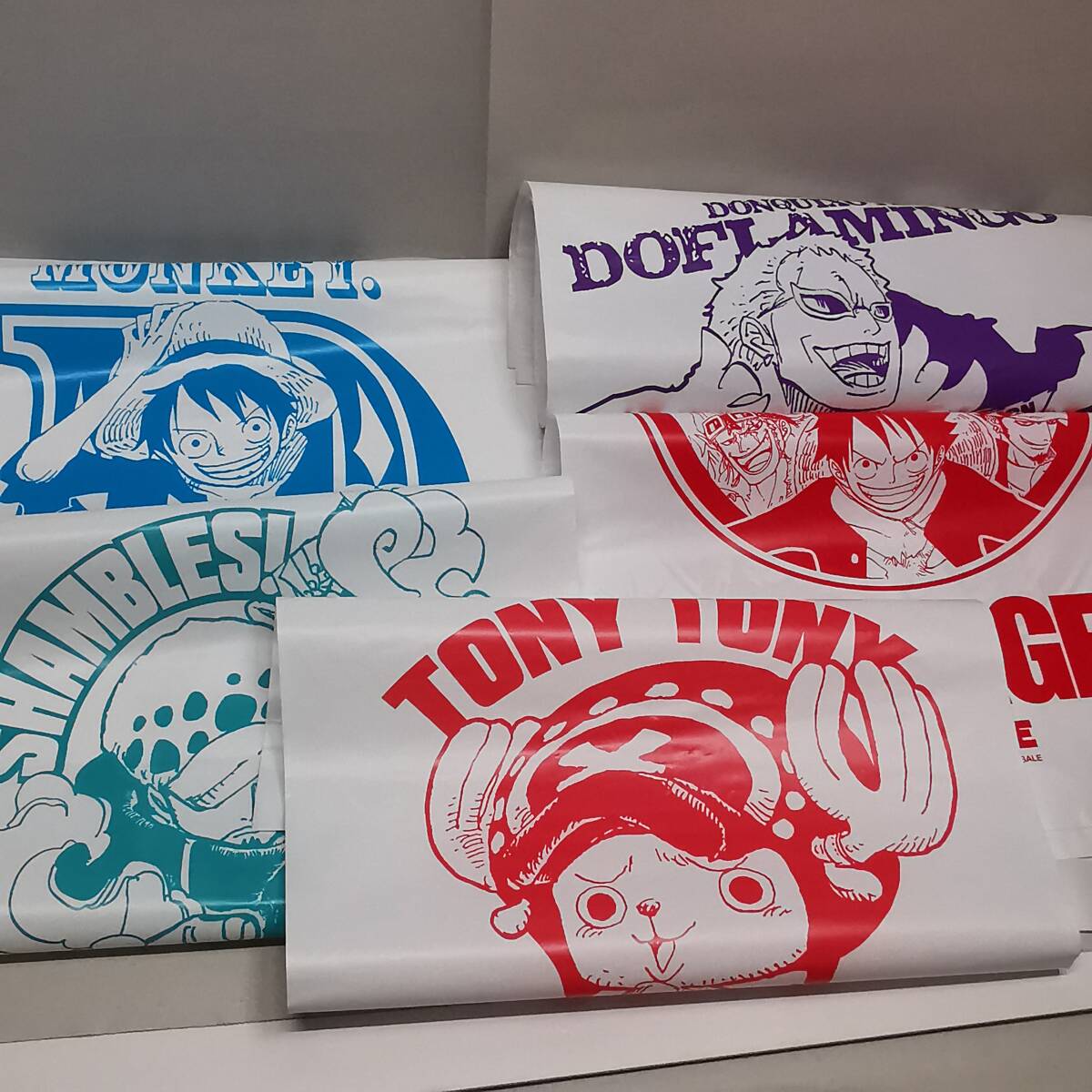 > 未使用◆ONE PIECE ビニールショッパー(チョッパー/トラファルガー/ ルフィ/最悪の世代/ドフラミンゴ)5枚セット◆レジ袋 集英社 FCB2