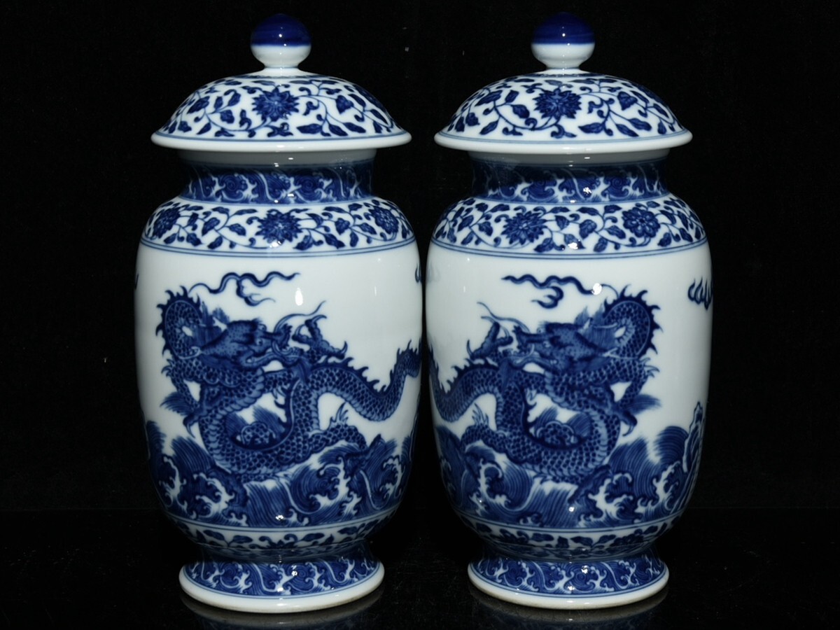 - 「清 乾隆年製 陶磁器 青花龍紋蓋罐一対」染付 置物 擺件 古賞物 中国古美術 旧蔵出