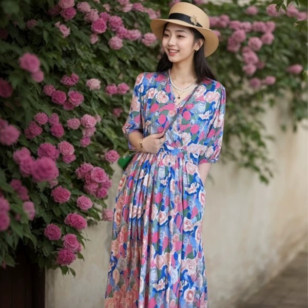 - mc 0705 半袖 ポケット ワンピース ゆったり オシャレ 裾広がる 通気性手触り抜群 肌に優しい ドレープ性 大人可愛 着丈120㎝ 柄63