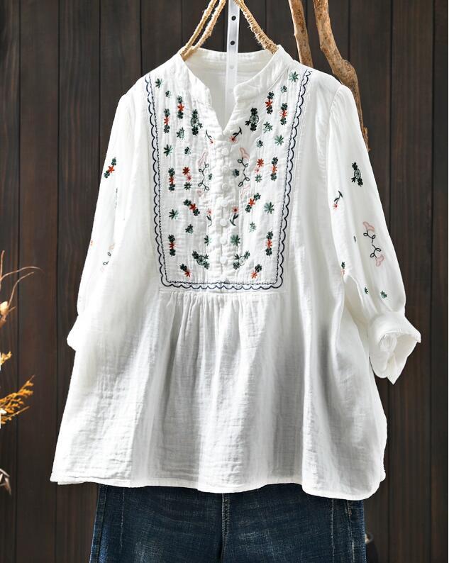 - 新入荷ダブルガーゼ 刺花柄 フリーサイズ ワイシャツ チュニック トップス 綿100% 大人可愛 ナチュラル ふんわり ホワイト