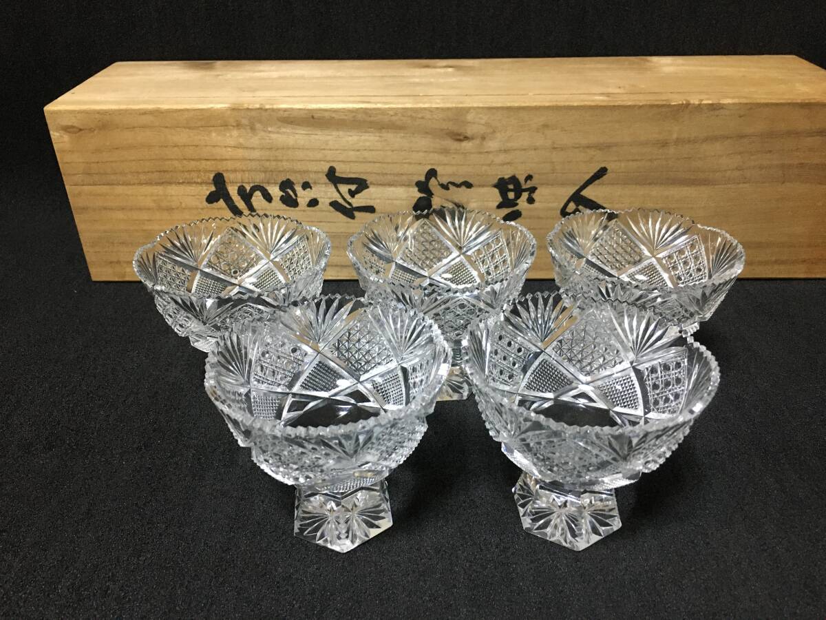 - 【D741】銀座 WAKO クリスタルガラス 高台付 珍味入 共箱 アイスクリーム 盃 小鉢 カットガラス