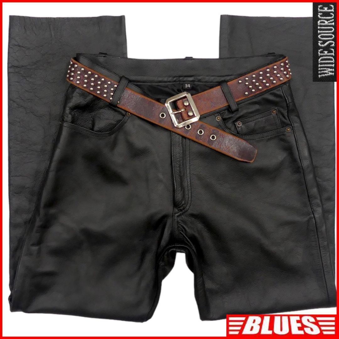 - 即決★WIDE SOURCE★W34 レザーパンツ ワイドソース メンズ 黒 本革 ライダースパンツ 本皮 パンクロック ライディング ツーリング