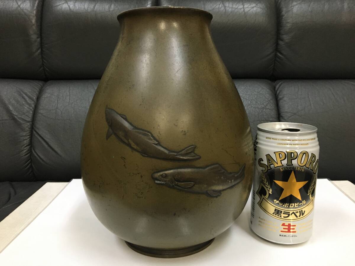 - 真鍮製・アユ紋様・作者名彫刻あり「花 花器 壺 」高さ約24cm 直径(最大幅)約19Cm 鮎 あゆ 川魚(電話後ろ下保管)