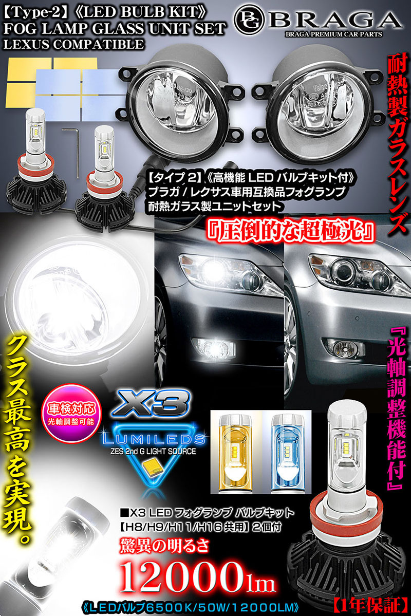 > T-2[LS460中期レクサス]高性能LEDバルブキット付/純正交換フォグランプ耐熱ガラスレンズ左右セット/防水/車検対応/ブラガ