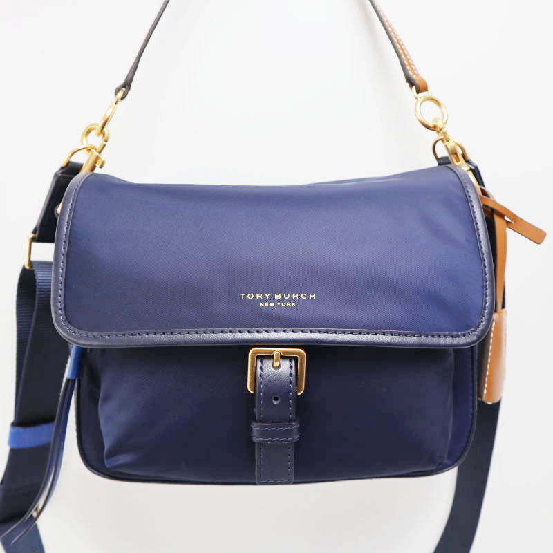 - M06-k017 美品 TORY BURCH トリーバーチ チャーム ナイロン/レザー フラップ 2WAY ハンドバッグ ショルダーバッグ ネイビー/チャ