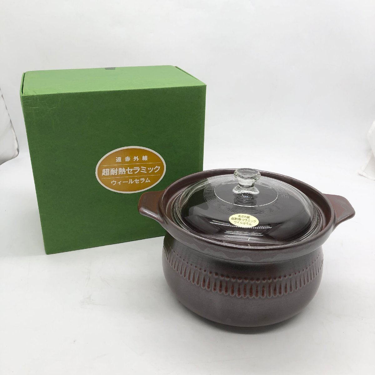 > ◎N922【未使用】ウィールセラム 超耐熱セラミック両手鍋 ガラス蓋付 GL-61 直径19cm 直火用 遠赤外線効果 硬質 軽い (ma)