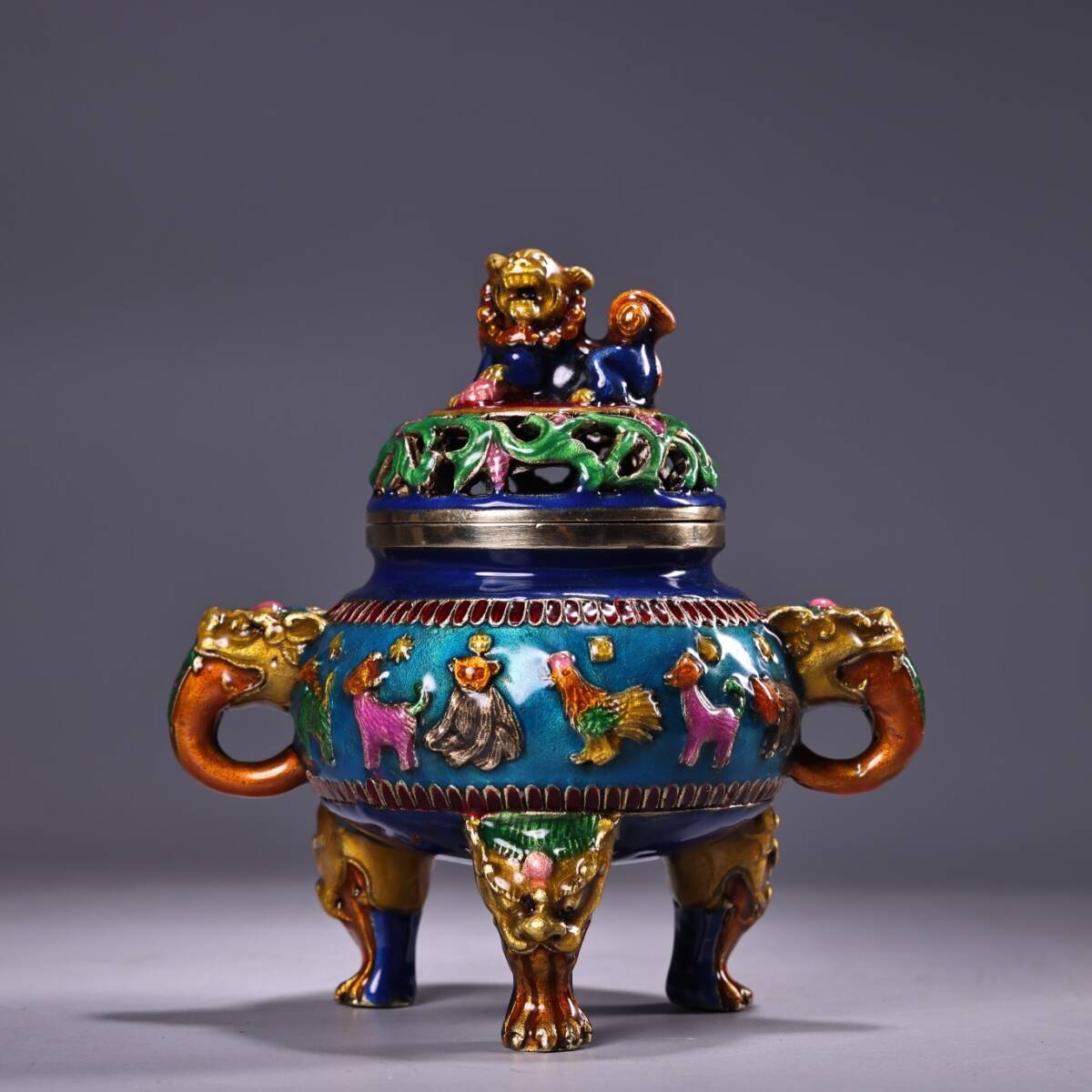 - 蔵友旧蔵出 銅製 景泰藍 琺瑯彩 十二生肖紋 三獣足雙象耳 獣鈕熏香爐 貴重品 置物 古賞物 中国古玩 中国古美術品