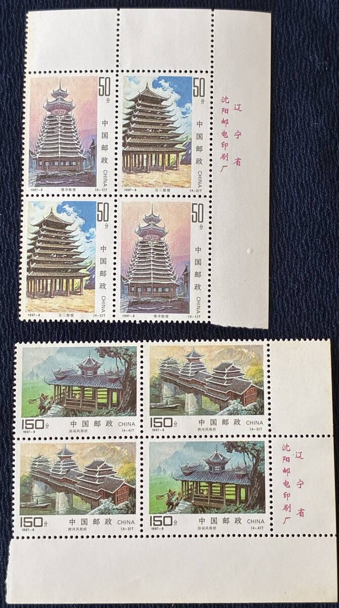- 新中国切手ー未使用 1997-8T (トン)族の建築 4種完ペア 2種連刷×2田形 廠銘耳付き