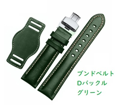 - 【J】ブンド レザーベルト グリーン Dバックル 18mm 20mm 21mm 22mm 牛革 腕時計用ベルト ばね棒付 交換用 アレルギー対策【新品】
