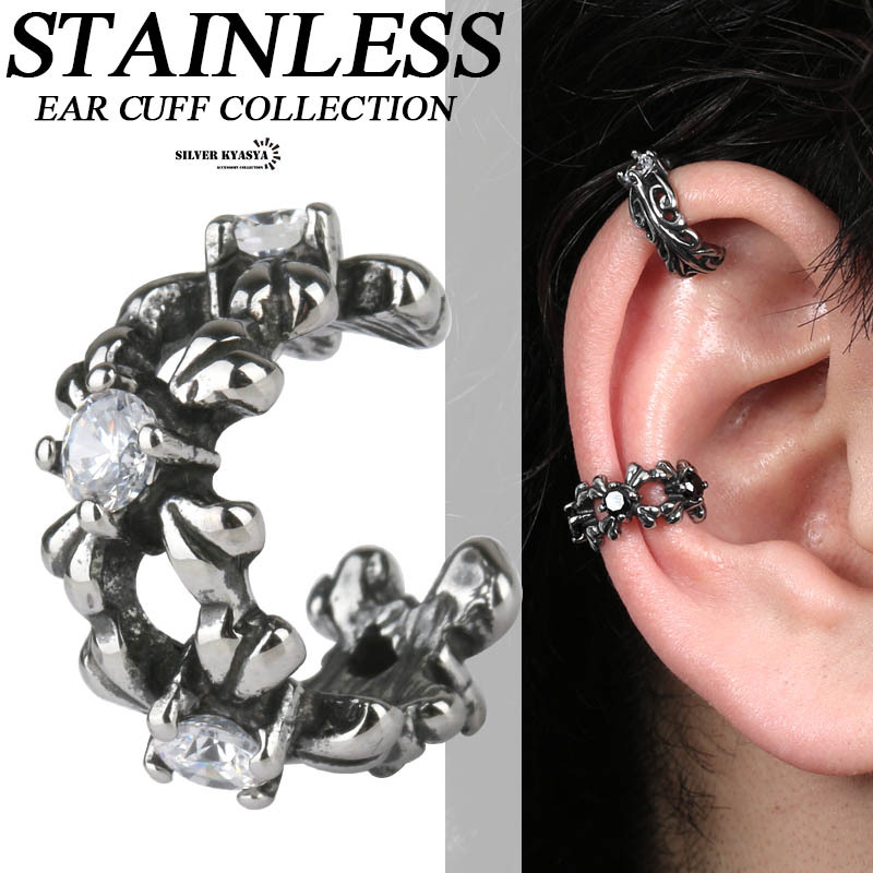 - (ブラックストーン) ステンレス イヤーカフ シルバー オニキス ブラック 片耳用 イヤーカフ クロス ノンホール ピアス