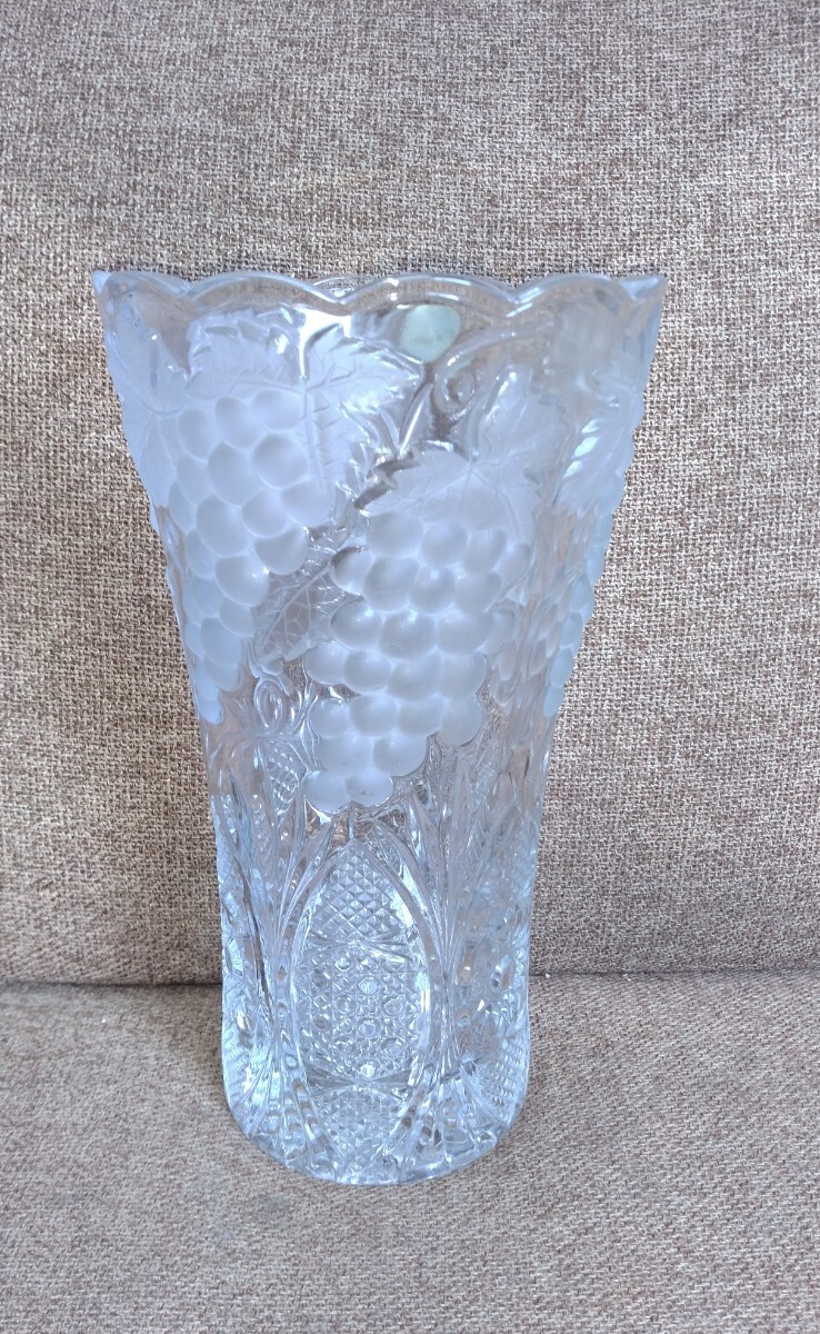 - K122【未使用/保管品】 SOGA硝子 フラワーベース クリスタルガラス パイン・葡萄 絵柄 インテリア雑貨 花器 花瓶 花入 CRYSTAL 元箱