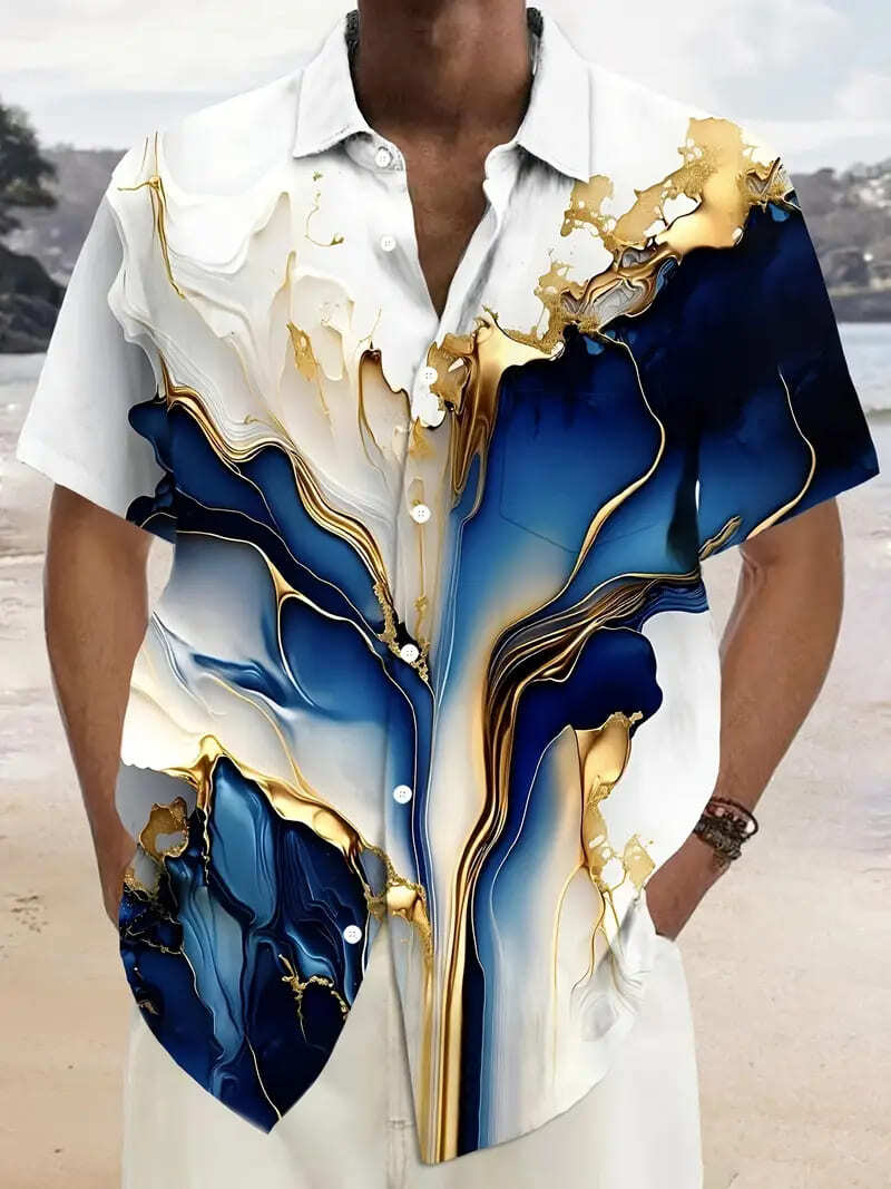 - マーブル柄 半袖シャツ アロハシャツ 240 白×青 柄シャツ ストリート HIPHOP ヤクザ ヤンキー オラオラ系 ホスト 服 メンズ ファッション