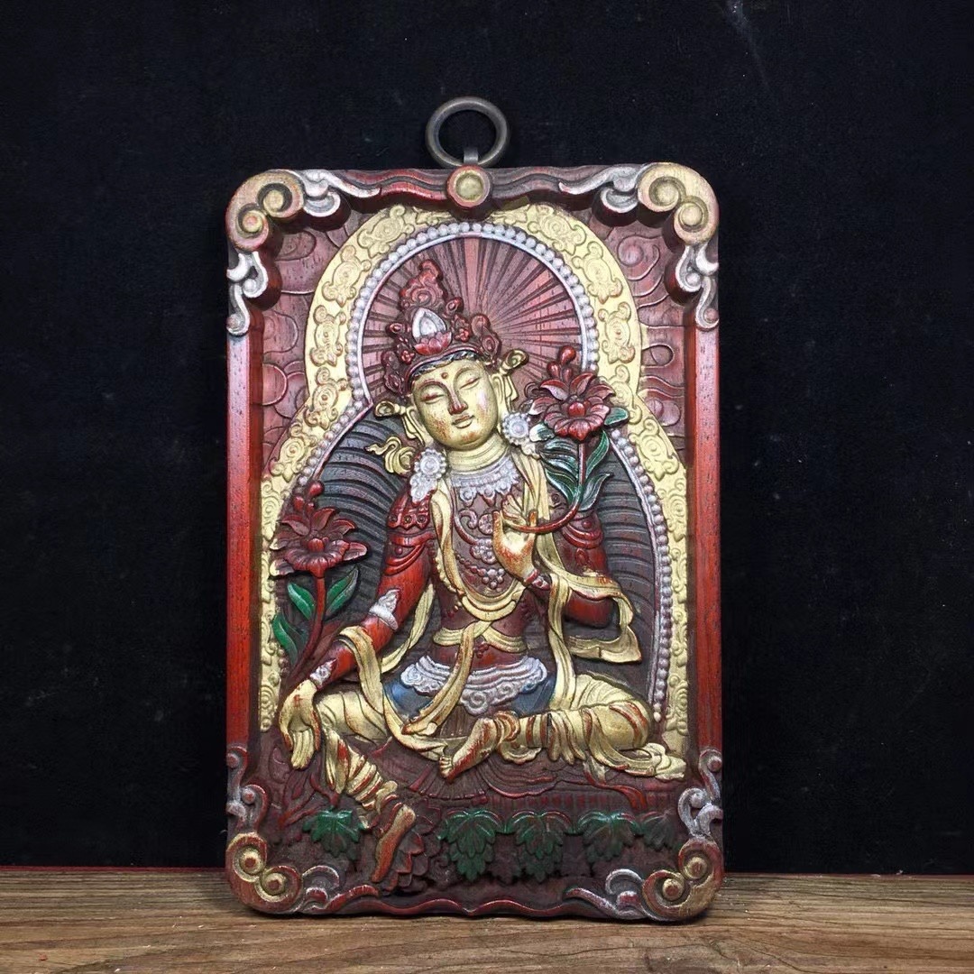 > 早期收集 古紅木彫 仏教古美術 彩絵 度母觀音 仏像 壁挂 墻挂 古擺件 時代物 古董品 骨董 旧家蔵出し 唐物 中国古玩 古美術品