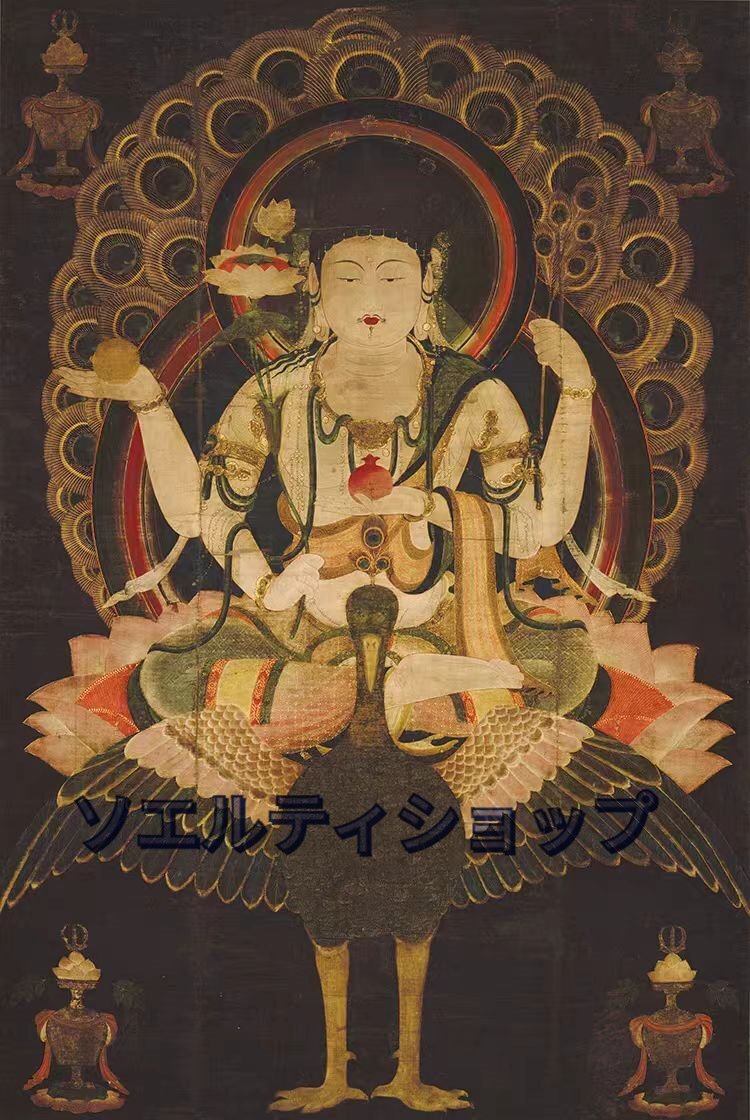 - 密教 仏像 孔雀明王 孔雀王母菩薩 仏画 仏教美術 絹布 絹本 掛け物 未表装