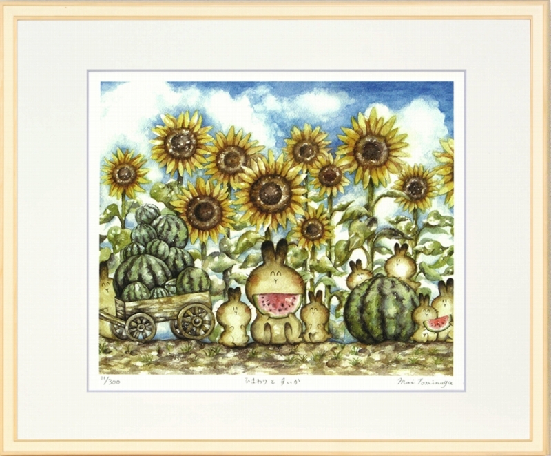 - ジークレー版画 額装絵画 とみながまい 「ひまわりとすいか」 四ッ切