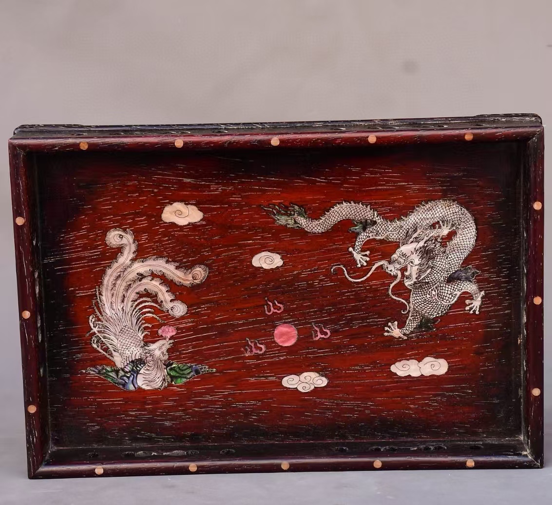 > 古木彫り 秘藏 清代 古代紫檀に貝竜鳳凰をちりばめた祥茶皿 書道具 文房具 時代物 中国古美術 細密彫 置物 賞物 唐物 木彫り 文玩 6.5
