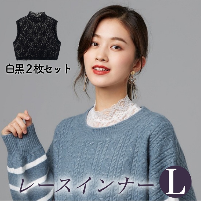 - 送料無料★即納 新品 2枚セット 白 黒 レースインナー 重ね着 チラ見せ おしゃれ ハイネック へそ出し★L
