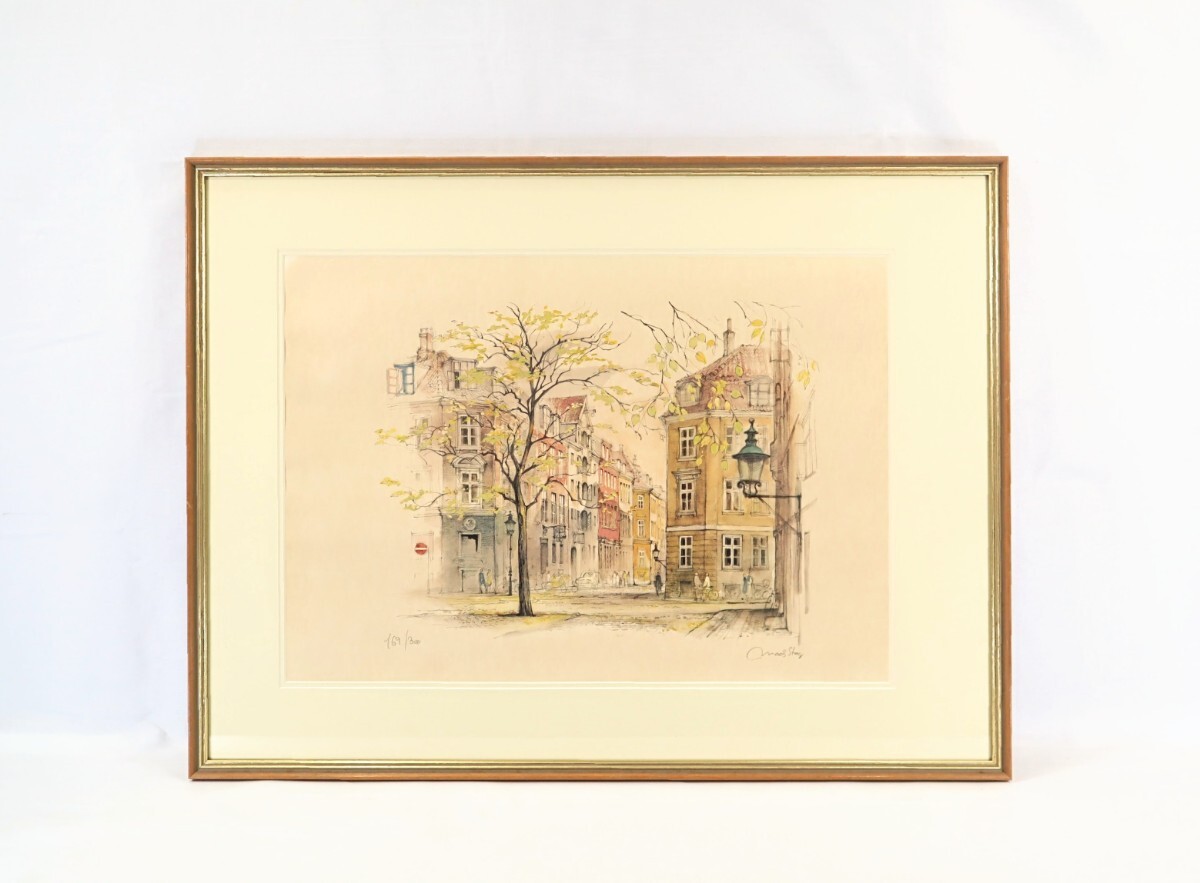- 真作 マッズ・ステージ リトグラフ「静かな街角」画寸 57cm×40.5cm デンマーク人作家 牧歌的な絵画 やわらかな色彩と繊細で淡い線 10937