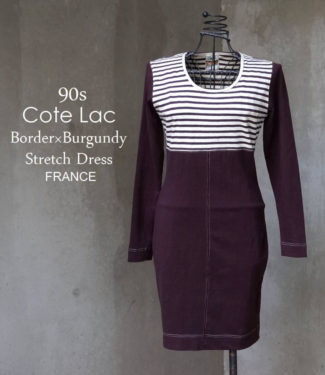- 90s フランス発 コテラック Cote Lac 霜降りボーダー×バーガンディ ストレッチ 長袖 ワンピース 2 M