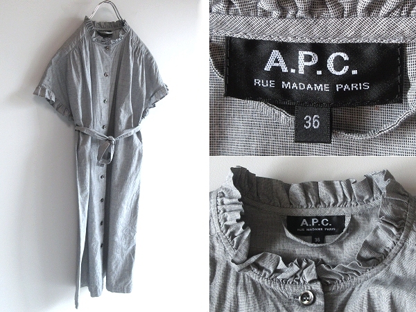 - 美品 定価38500円 A.P.C. アーペーセー 2021SS ROBE A COL VOLANT 21E JPS ベルト付 コットン フリル襟 シャツワンピース 36 グレー