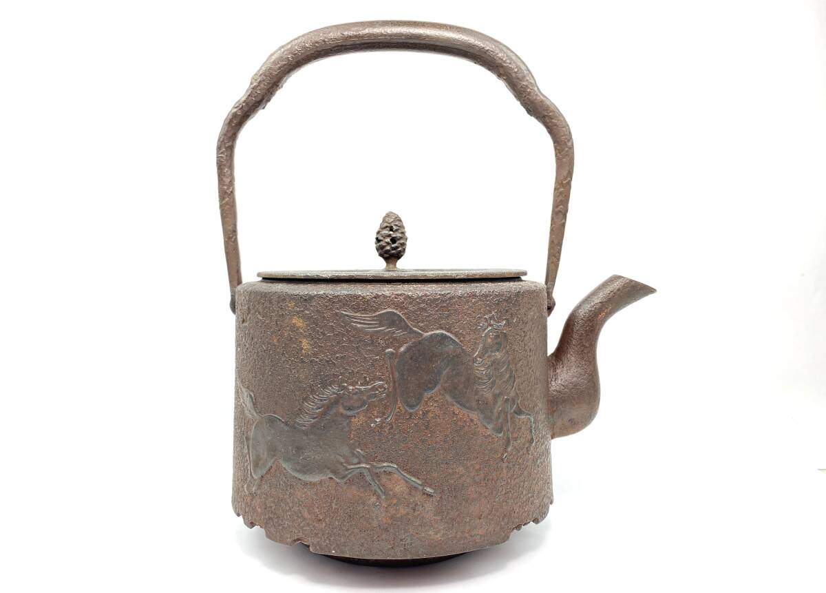 - TM/南部釜師 中村徳次郎(立徳)造 石肌 山双馬紋 松毬摘 寸胴形 鉄瓶 2613g 南部鉄器 茶道具 0607-3