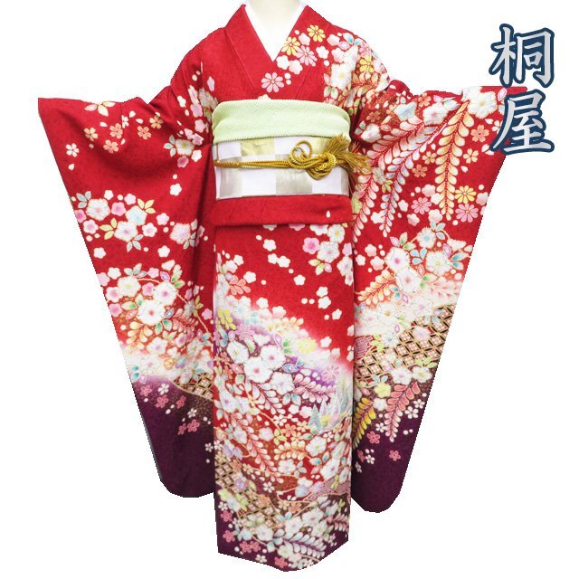 - 特選 振袖 着物 中古 正絹 桐屋 翠山工房 徳永憲峯 辻が花 絞り 銀通し 赤色 多色 金 身丈174cm 裄70cm L トール きもの北條 A1205-8