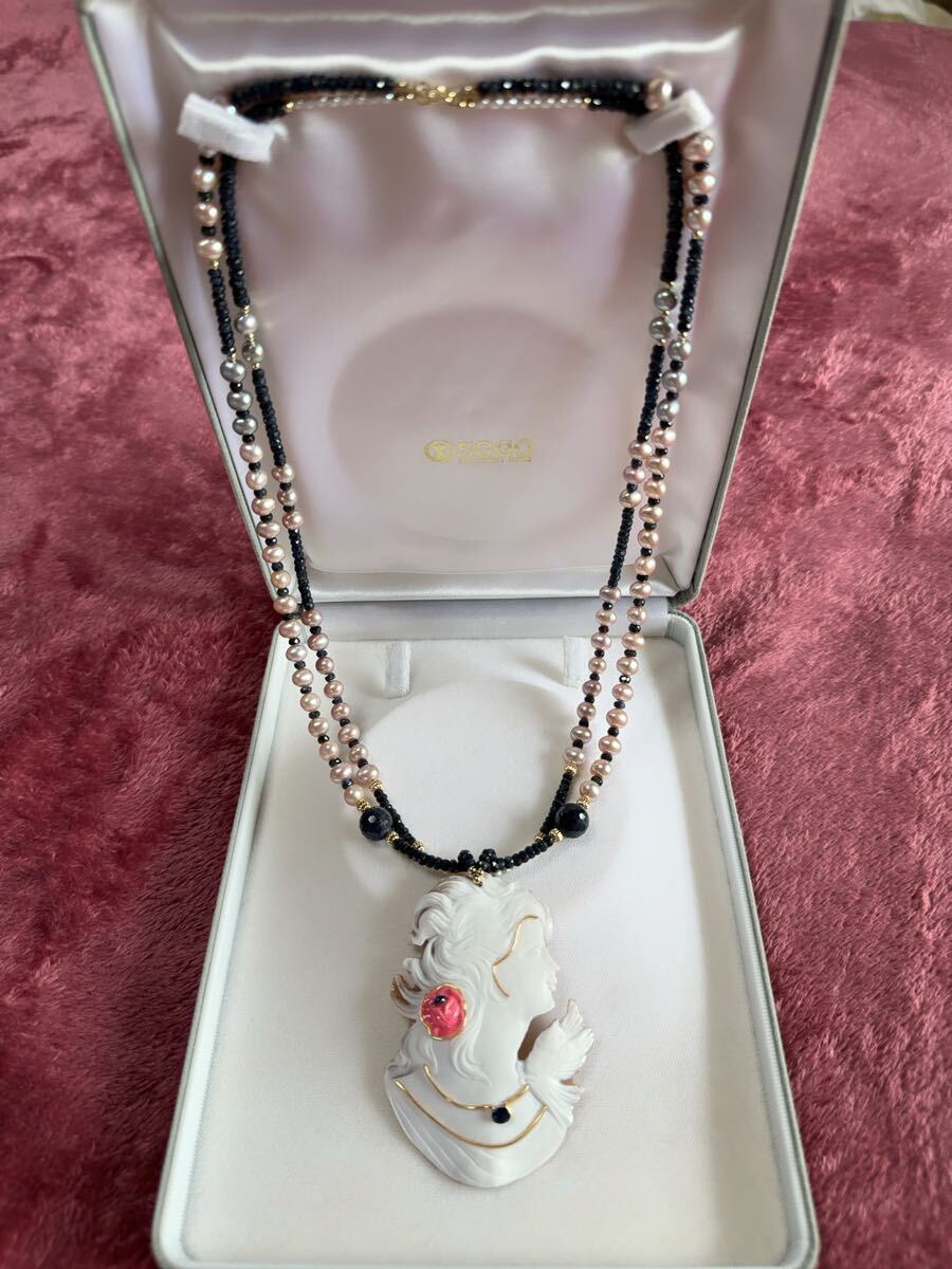 - K18金サファイア&パール&シェルカメオコンビ二連デザインネックレス 60cm