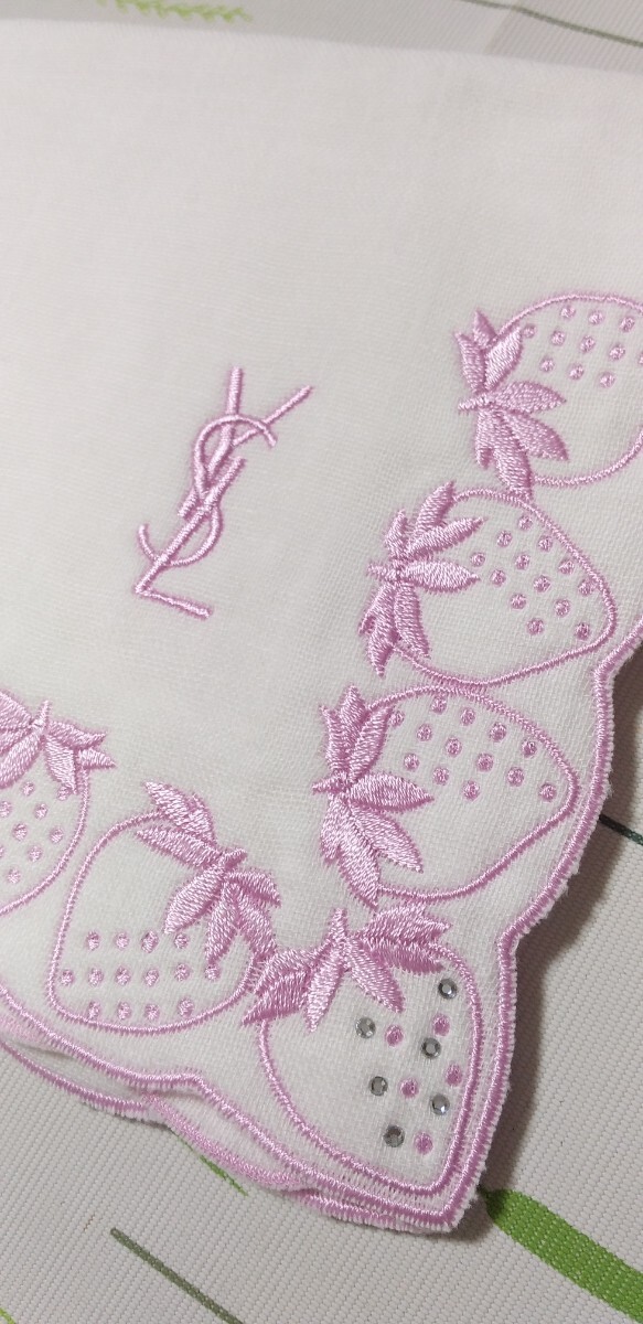 - 送料無料! イヴ サンローラン いちご 柄 ストロベリー 苺 ガーゼ タオルハンカチ ストーン付き 未使用品