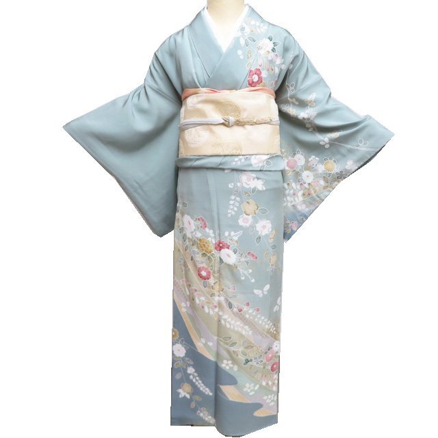- 訪問着 着物 中古 正絹 袷 フォーマル 花の図 反端付き 錆青磁色 多色 金 身丈160.5cm 裄64cm M きもの北條 A1206-4