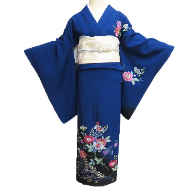 - 付下げ 付け下げ 訪問着 着物 中古 正絹 袷 刺繍 花の図 金糸 紺色 黒色 多色 身丈166cm 裄68.5cm L トール きもの北條 A1206-7