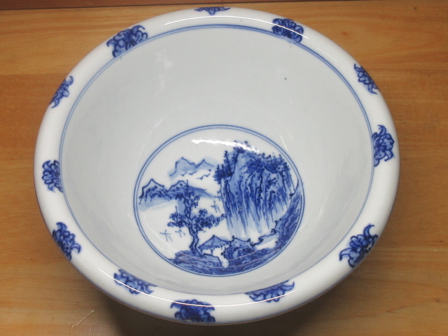 - ★染付・山水図回り鉢★清朝/焼き物/完品★鉢と高台の間に隙間があり、そこが回る★骨董・レア・ビンテージ・レトロ・アンティーク・美品★