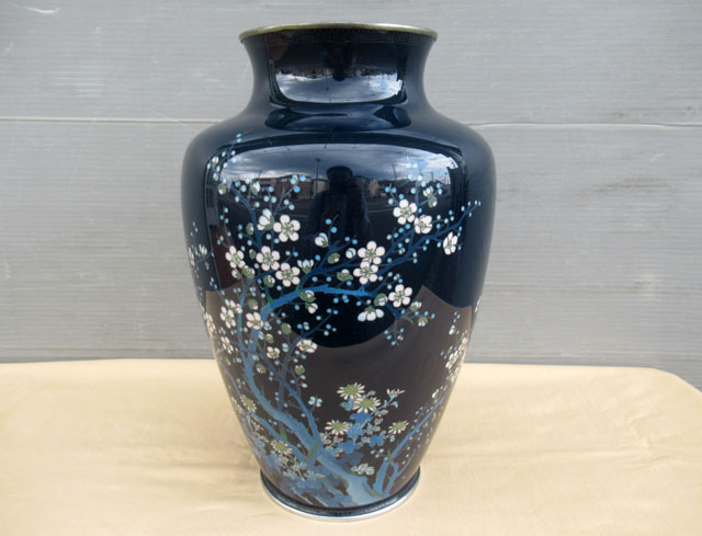 - 即決■七宝 花瓶 紺色 花模様 高さ30cm■つ-26